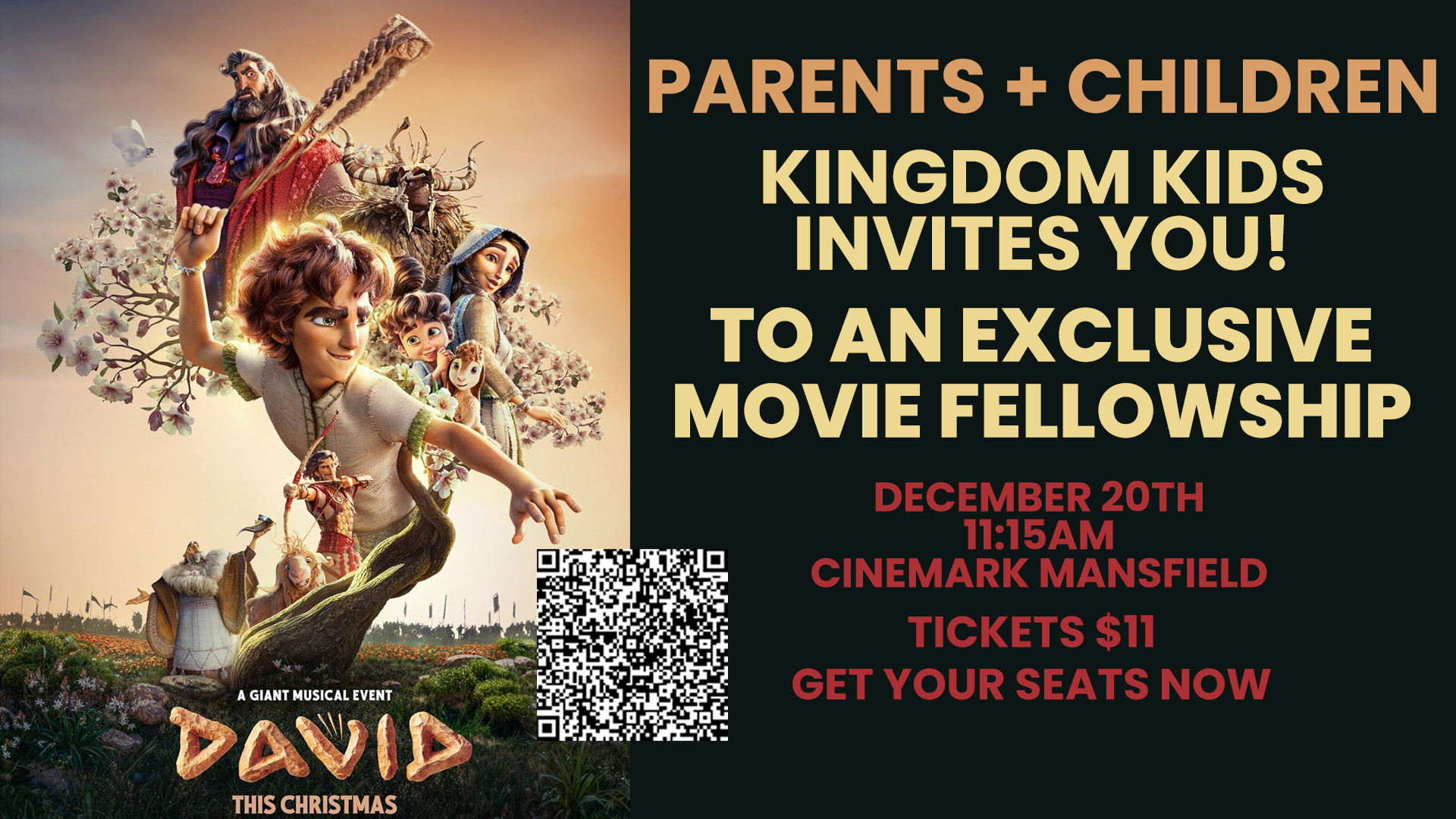 Parents, we’re inviting you and your children to an exclusive movie event with our Kingdom Kids Ministry! We’ll be seeing the movie, David, in a theater of our own ... just for us!We’d love to fill the theater with kids and parents who love Jesus as we see the story of David unfold.TAP HERE TO …