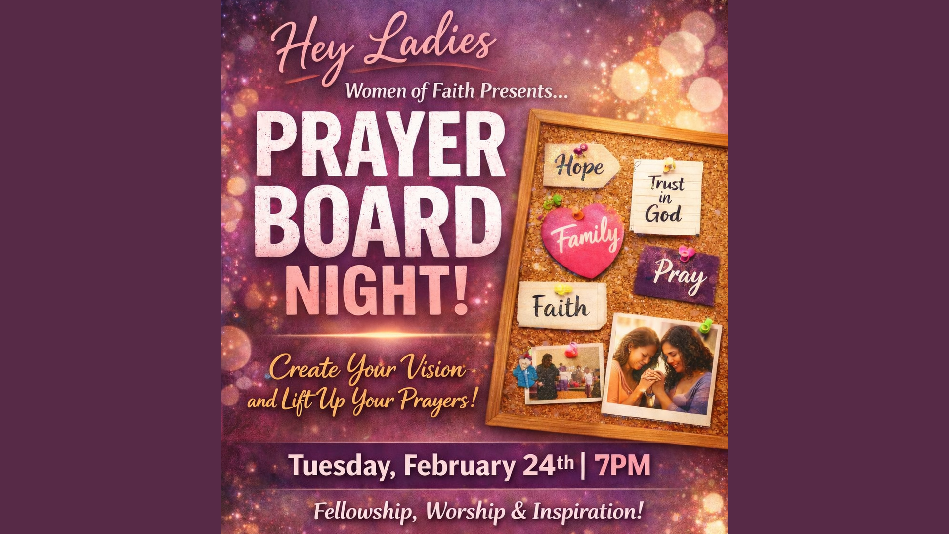 We’re kicking this year off with a Prayer Board Night, so grab your friends, bring your boards, and meet me February 24th for a night of vision, fun, and fellowship. Let’s pray, create, and pour into one another.